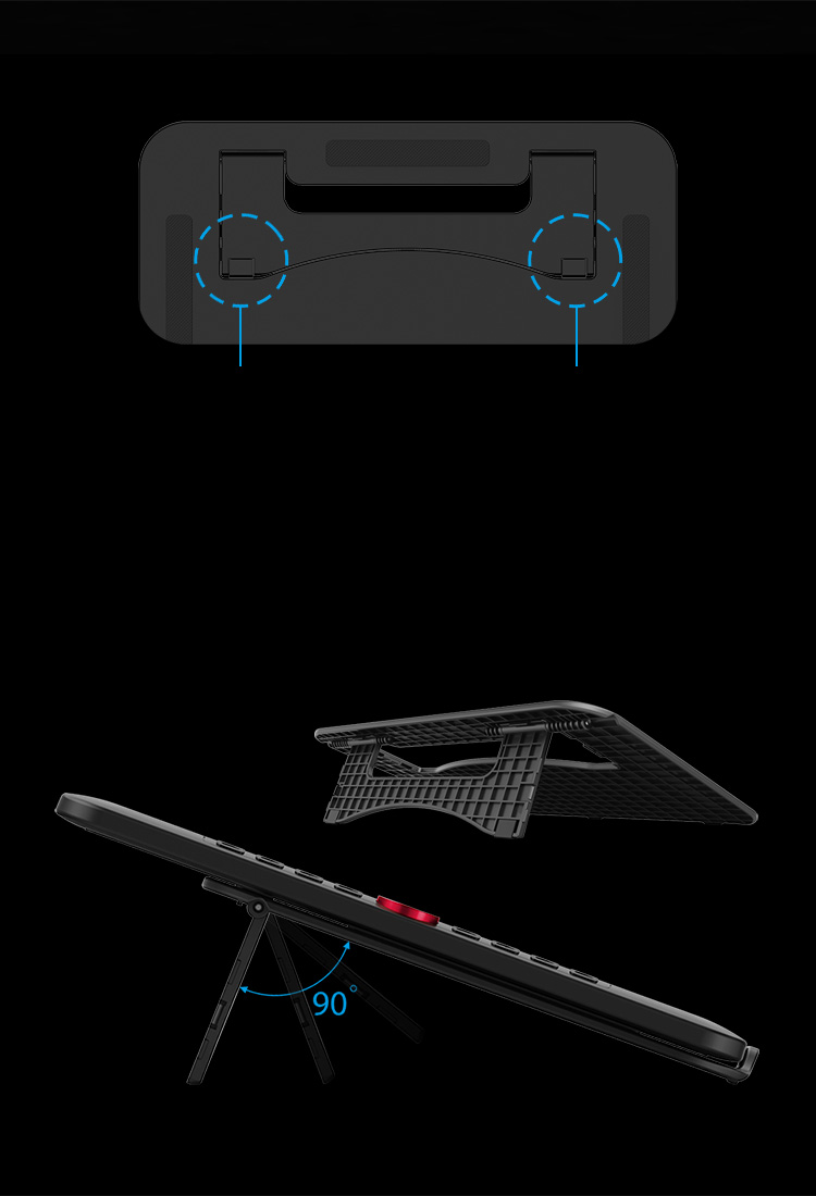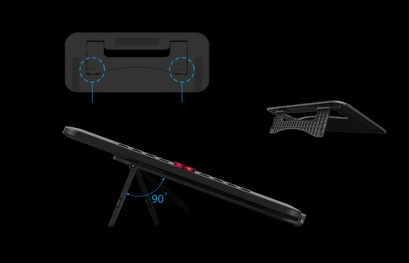 Simply press down, pull the support plate back as shown, and adjust it to 90 degrees for stable support. Place your tablet on the stand and start creating!