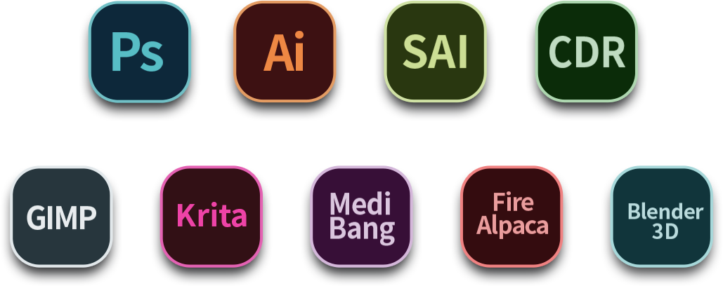 Support popular digital art software such as Adobe Photoshop, Illustrator, SAI, CDR, GIMP, Krita, MediBang, FireAlpaca and Blender3D, etc.