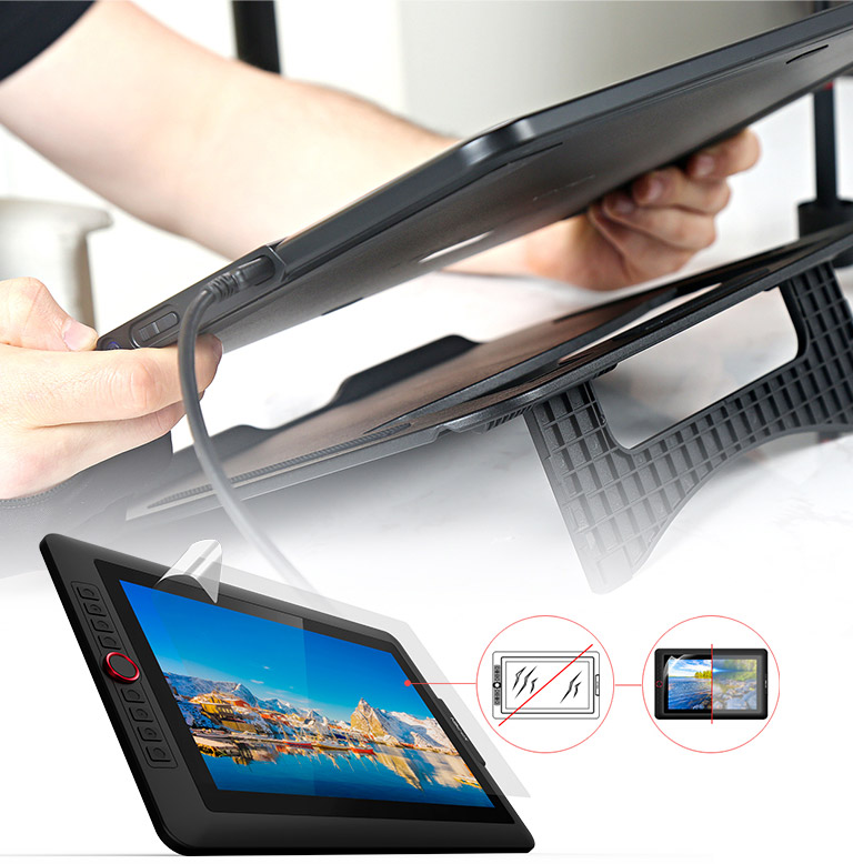 The portable stand is built to prevent shaking or sliding as well as relieve eye fatigue and hand stiffness. It also comes with a protective film to help protect your screen and reduce glare, while the pen holder keeps your pen and pen nibs safe and doubles as a pen stand or pen holder.
